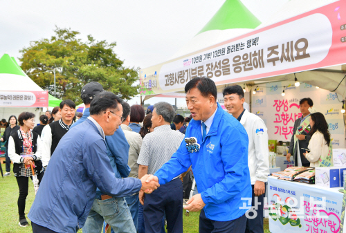 | 지난 황룡강 가을꽃축제 기간 고향사랑기부제 홍보부스를 찾은 김한종 장성군수가 방문객을 반기고 있다. |