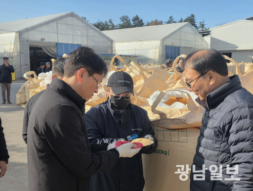 | 농협 전남본부는 2025년산 공공비축미 포대벼 수매가 본격화됨에 따라 21일 봉황농협DSC를 찾아 현장을 점검하고 농업인을 격려했다. |
