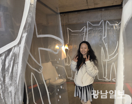 ‘자아결정’이라는 타이틀로 열리는 이번 전시에서 작가는 커다란 건축용 비닐 위에 고양이를 드로잉했다. 움직임을 최소화하고 크기를 크게 확장한 결과, 고양이는 단순한 동물이 아니라 인간적인 표정을 지닌 의인화된 존재로 작업했다. 그는 “드로잉은 순간을 붙잡는 일”이라며 “그 형상이 관객에게 또 다른 시선과 감각을 열어주는 장치가 되기를 바란다”고 말했다.