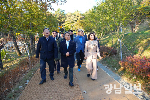 | 지난 21일 광주 서구 백석산 일원에서 열린 ‘마륵근린공원 개장식’에 참석한 강기정 광주시장과 김이강 서구청장 등이 산책길을 걷고 있다. 사진제공=광주시 |