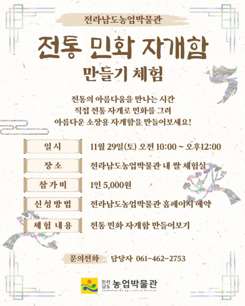 김옥경 전남농업박물관장은 “민화와 자개라는 전래 공예를 직접 체험함으로써 전통문화의 아름다움과 가치를 재발견하는 뜻깊은 체험이 될 것”이라며 “앞으로도 다양한 체험 프로그램을 통해 지역 주민이 전통문화를 즐기고 배우는 박물관의 문을 활짝 열겠다”고 말했다.