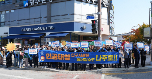 | 인공태양 연구시설 유치 나주시민추진위원회가 7일 오전 전남 나주시 빛가람동 한전KDN 사거리에서 태양에너지가 만들어지는 원리를 활용한 핵융합 연구시설의 나주 유치를 위한 홍보 캠페인을 하고 있다. |