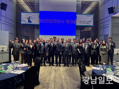 | 광주고등법원이 24일 홀리데이인 광주호텔 ‘골드 앤 그라데이션 홀’에서 진행한 ‘2025년 국선전담변호사 워크숍’ 참가자들이 기념사진을 찍고 있다. |