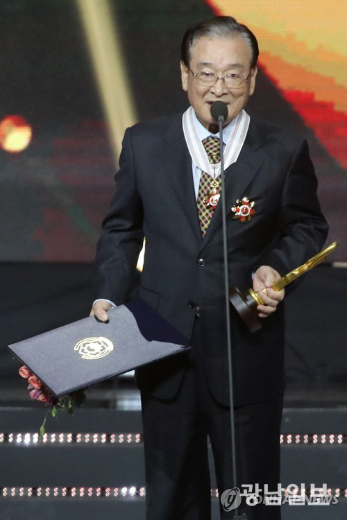 | 배우 이순재가 24일 오후 서울 송파구 올림픽공원 올림픽홀에서 열린 2018 대한민국 대중문화예술상 시상식에서 은관문화훈장 수상 후 소감을 말하고 있다. 연합뉴스 |
