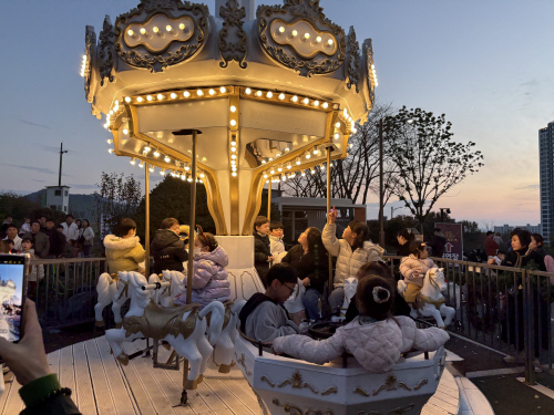 | 회전목마 놀이기구를 타며 즐거워하는 아이들 |