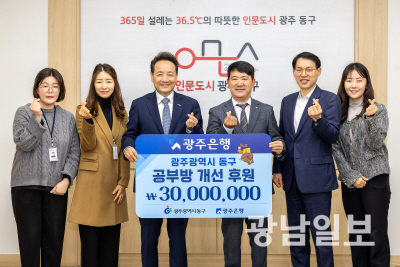 | 광주은행은 25일 광주 동구청에 ‘희망이 꽃피는 공부방’ 사업을 위한 후원금 3000만원을 기탁했다. |