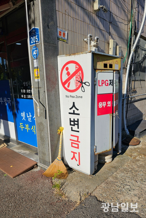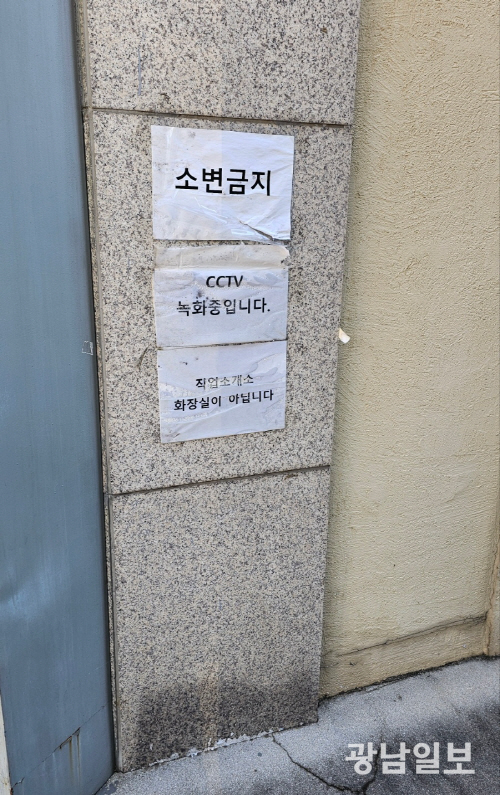 #1. 광주 북구 유동의 한 식당가 외벽에는 붉은색으로 ‘노상방뇨를 금지한다’는 픽토그램이 그려져 있다. 불과 200m 떨어진 다른 골목에도 ‘직업소개소 화장실이 아닙니다’, ‘CCTV 녹화 중’이라는 문구가 적힌 벽보가 붙어 있다. 시멘트 벽은 오랜 노상방뇨로 검게 변색된 상태였다. 가까이 다가가면 지독한 냄새가 코를 찌른다.