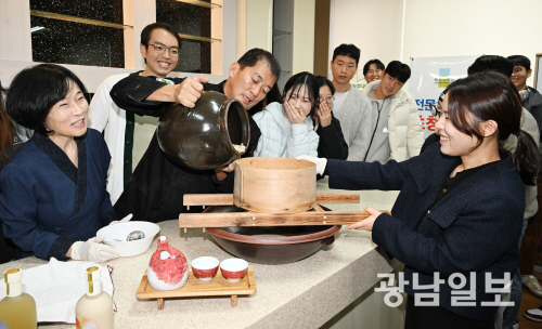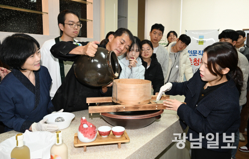 최기남 기자 bluesky@gwangnam.co.kr 25일 오후 광주 남구 광주대학교 전산관에서 열린 ‘전문직업인 초청 특강’에서 항공서비스학과와 호텔조리제과제빵학과 학생등 참가자들이 동명동 꿈브루어리 대표가 시연하는 전통주(막걸리) 만드는 과정을 배우고 있다.