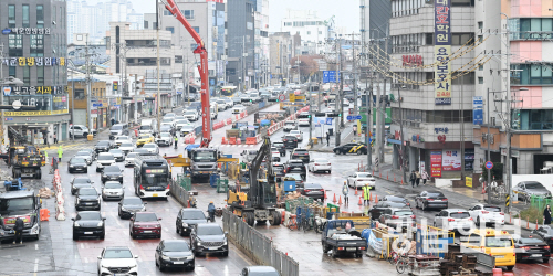 광주 도시철도 2호선 공사로 인해 백운광장 일대가 부분 통제된 첫 날인 25일 주월교차로에서 백운광장으로 이어지는 도로가 극심한 차량정체를 빚고 있다. 도시철도 건설공사와 대남대로 지하차도 공사가 동시에 실시되는 주월교차로에서 백운교차로까지 280미터 구간이 다음달 22일까지 기존 편도 3,4차로가 2,3차로로 줄어든다.