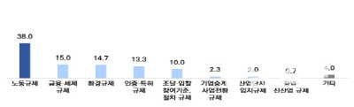 기업들이 가장 부담을 느끼는 규제는 ‘노동 규제’(38.0%)로 집계됐다. 이어 △금융·세제 규제(15.0%) △환경 규제(14.7%) △인증·특허 규제(13.3%) △조달·입찰 기준 및 절차 규제(10.0%) 순이었다.