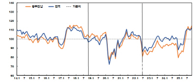 26일 한국은행 광주전남본부가 광주·전남 도시 지역 600가구(응답 524가구)를 대상으로 실시한 11월 소비자동향조사 결과, 소비자심리지수(CCSI)는 114.7로 전월 대비 3.4p 상승했다.