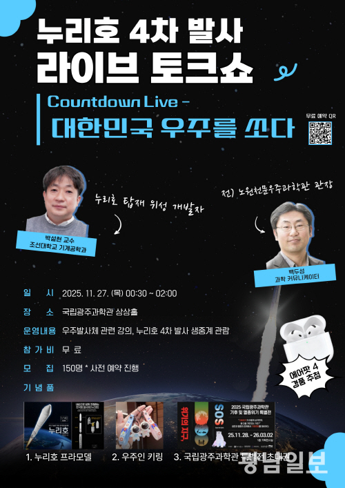 이번 라이브 토크쇼는 누리호 4차 발사 전 과정을 과학관에서 생중계로 함께 관람하는 참여형 행사로, 우주항공 전문가와 실시간으로 소통하며 발사 과정을 생생하게 체험할 수 있다. 누리호 4차 발사는 오는 27일 새벽 00시 54분부터 01시 14분 사이에 예정돼 있으며, 토크쇼는 이에 맞춰 00시 30분부터 약 1시간 동안 진행될 예정이다.