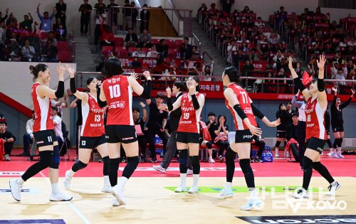 | AI페퍼스 선수단이 한국도로공사 배구단과의 진에어 2025-2026 V리그 여자부 1라운드 첫 번째 경기에서 승리한 뒤 기뻐하고 있다. 사진제공=KOVO |