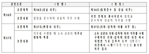 26일 인사혁신처 등에 따르면 현행 국가공무원법 제57조의 ‘공무원은 직무를 수행할 때 상관의 명령에 복종해야 한다’는 표현은 ‘상관의 지휘·감독에 따를 의무’로 변경하는 개정안을 입법 예고했다.