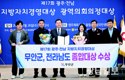 26일 오후 광주 서구 풍암동 염주체육관 내 올림픽기념국민생활관에서 열린 ‘제17회 광주·전남 지방자치경영대상·광역의회 의정대상’시상식에서 종합대상(전남도지사상)을 수상한 김산 무안군수(왼쪽 세번째)와 축하객들이 기념촬영을 하고 있다.
