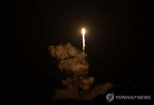 | 한국형발사체 누리호가 27일 새벽 전남 고흥군 나로우주센터에서 발사되고 있다. 이번 누리호 4차 발사에는 무게 516㎏ 주탑재위성 ‘차세대중형위성 3호’와 부탑재위성 12기 등 총 13기 위성이 실렸다.(연합) |