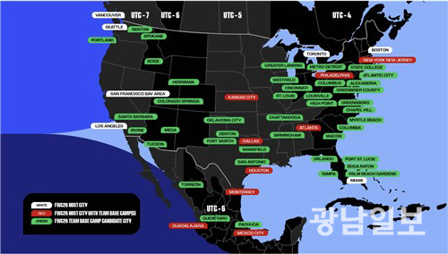| 북중미 월드컵 개최 도시와 베이스캠프 후보지 현황[FIFA 제공. 재판매 및 DB 금지] 연합뉴스 |