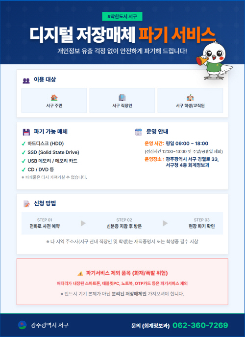 김이강 서구청장은 “디지털 기기의 교체 주기가 짧아지면서 폐기해야 할 저장매체가 증가하고 있지만 개인정보 유출 우려로 적절히 처리하지 못하는 경우가 많다”며 “이번 서비스를 통해 개인정보 보호는 물론, 자원 순환과 환경 보호에도 기여할 것으로 기대한다”고 말했다.