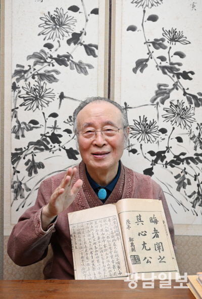 | 민족문제연구소 지도위원이자 식민지역사박물관 명예관장인 심정섭씨가 30일 친일 유림단체 ‘대성문학원’의 도유사이자 대한제국 육군 보병 참위(소위) 정인찬의 저서 ‘해동윤강록’을 공개했다. 최기남 기자 bluesky@gwangnam.co.kr |