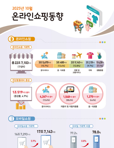 국가데이터처가 1일 발표한 2025년 10월 온라인쇼핑 동향에 따르면 10월 온라인 쇼핑 거래액은 22조7103억원으로 전년 동월(21억6584억원)보다 4.9% 증가했다.
