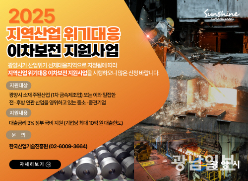 정해종 광양시 투자경제과장은 “이번 이차보전 지원사업이 지역 철강기업의 자금 유동성 확보에 실질적인 도움이 되어 지역경제 활성화로 이어지길 기대한다”고 말했다.