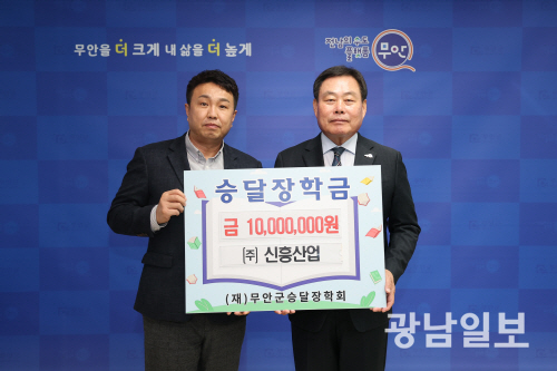 | ㈜신흥산업과 청솔수산 대표는 최근 지역인재 육성에 써달라며 각각 장학금 1000만원과 100만원을 무안승달장학회에 기탁했다. |