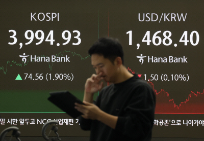 | 코스피가 전장보다 74.56p(1.90%) 오른 3,994.93으로 마감한 2일 오후 서울 중구 하나은행 딜링룸에서 딜러가 업무를 보고 있다. 연합뉴스@yna.co.kr |