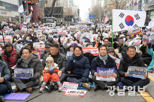 | 강기정 광주시장이 지난해 12월 14일 오후 금남로 일원에서 열린 광주시민 총궐기대회에 참석해 시민들과 함께 구호를 외치고 있다. 사진제공=광주시 |