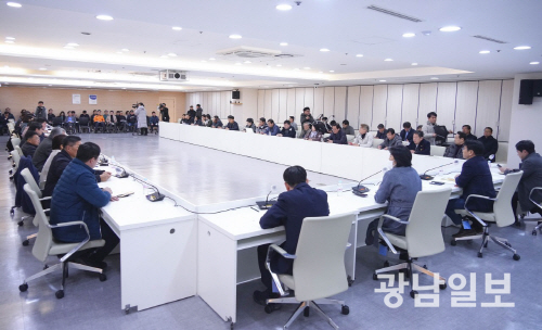| 강기정 광주시장이 지난해 12월 4일 시의원, 시민사회단체, 5·18단체, 학계, 종교계 등 광주지역 각계 대표들이 참여한 ‘헌법수호 비상계엄 무효선언 연석회의’를 주재하고 있다. 사진제공=광주시 |