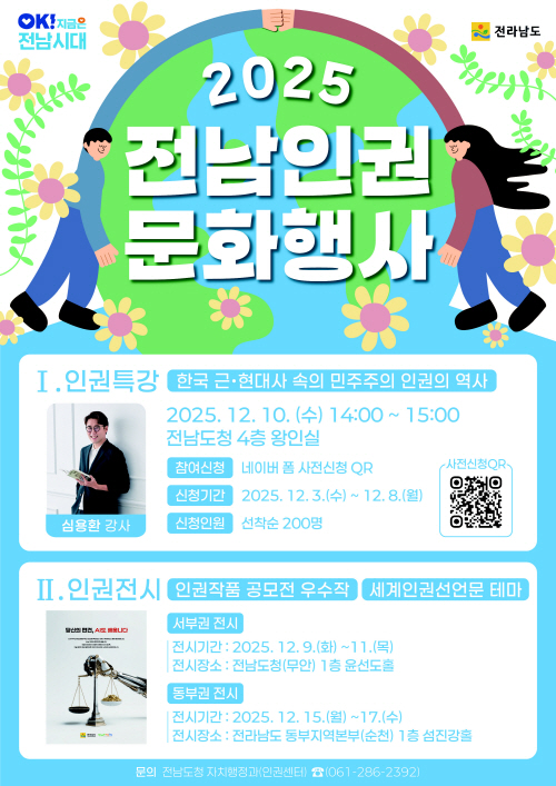 9일부터 11일까지는 전남도청 윤선도홀에서 ‘2025 전남도 인권공모전 우수작’과 ‘세계인권선언문 테마’를 전시한다. 이어 15일부터 17일까지는 전남도 동부지역본부 섬진강홀에서 전시회를 진행한다.