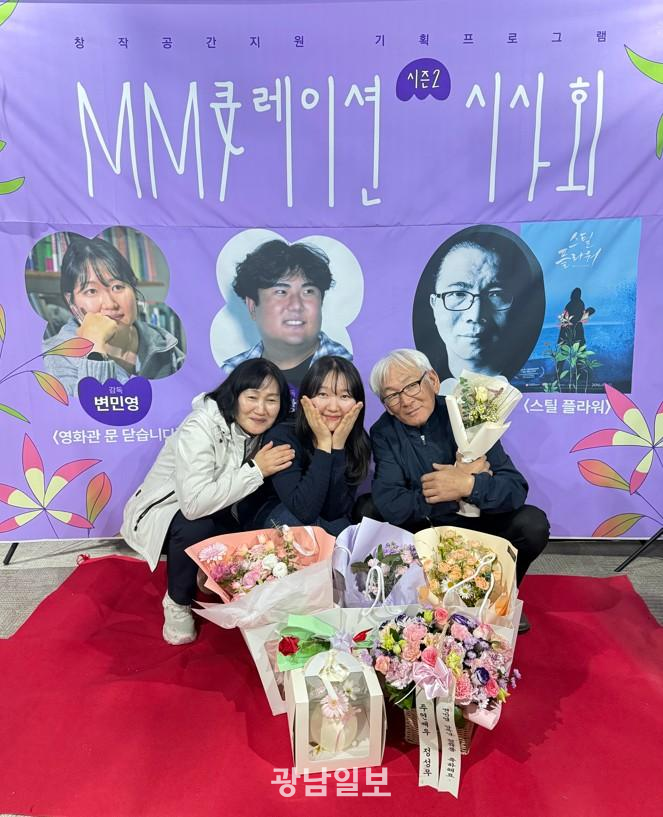 | 변민영 감독을 축하하기 위해 시사회를 찾은 부모님이 기념사진을 찍고 있다. |