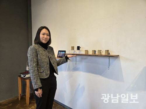 | 공예미술관 보임쉔 나지수 학예기획팀 팀원이 창작공간지원사업 결과발표회 성과공유전 ‘공예가의 집’에서 채지윤 작가와 이원규 작가가 협업한 컵을 소개하고 있다. |