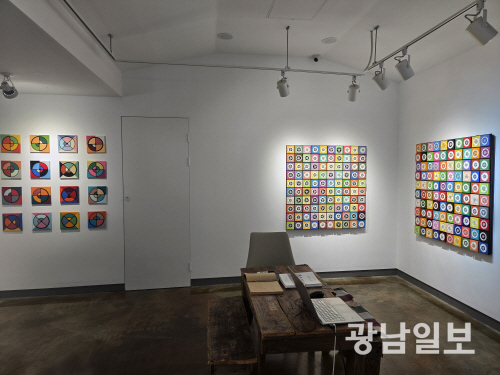 이번 전시에는 영상 작업이 중심이 된 가운데 규칙적으로 배열된 블록 구조가 회전하며 색과 패턴을 드러내는 과정을 통해 이미지가 구성되는 원리를 보여준다. 초기 화면은 비어 있는 장면처럼 보이지만, 블록의 회전이 축적돼 하나의 장면이 완성되는 순간, 관람자는 이것이 ‘기록된 실재’가 아니라 편집과 조합을 통해 만들어진 환영임을 체감하게 된다. 반복적으로 등장하는 원형 모티프는 필름 프레임의 구조를 연상시키며 대중매체 이미지가 형성되는 층위를 시각화한다.