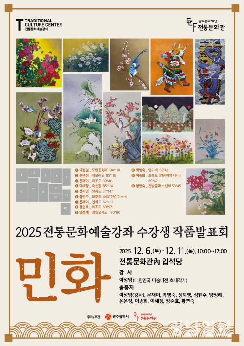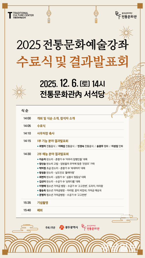 한편,2012년부터 진행된 전통문화예술강좌는 광주시 무형유산 보유자로부터 전통예술의 가치와 기술을 직접 전수받을 수 있는 프로그램으로 꾸준히 사랑을 받아왔다. 2026년 상반기 전통문화예술강좌는 2월부터 수강생 모집을 시작하여 3월 중순 개강할 예정이다.