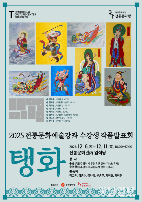 수료식은 상·하반기 수강생 수료증 전달식에 이어 1부 기능분야(탱화·민화·전통음식) 발표회, 2부 예능분야(판소리·판소리고법·가야금병창) 발표회 순으로 진행된다.