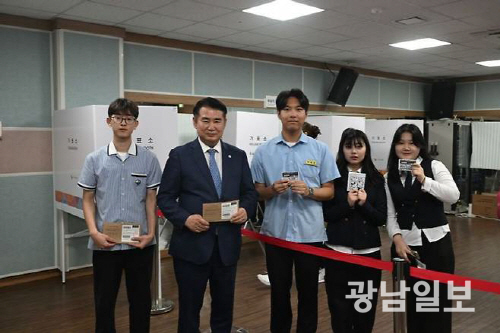 | 이정선 광주교육감이 29일 화정2동 행정복지센터에 마련된 투표소에서 생애 첫 투표자가 된 광덕고 하유성 학생회 부회장(왼쪽에서 첫번째), 광주고등의회 최장우 의장(가운데), 광주여고 노명선 학생회장, 광주여고 김지연 학생과 함께 투표 후 기념촬영을 하고 있다. 광주교육청 제공 |