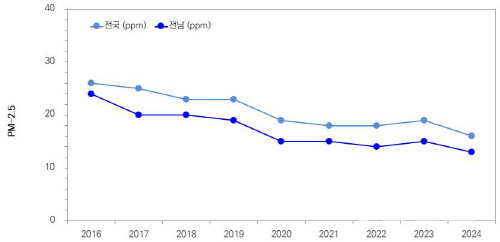 전남의 초미세먼지 농도는 등급별로 ‘좋음’(일평균 15㎍/㎥ 이하) 일수는 276일로 전년보다 33일 증가했고, ‘나쁨’(일평균 36㎍/㎥ 이하) 일수는 3일로 7일 감소했다. 또 대기오염 경보 발령도 크게 줄어 미세먼지 주의보는 2023년 23회에서 11회로 감소했고, 초미세먼지는 2024년 단 한 차례도 발령되지 않았다.