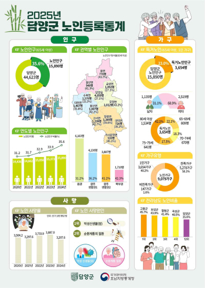 8일 국가데이터처 호남지방통계청이 발표한 2025년 담양군 노인등록통계에 따르면 노인 인구 비율은 2020년 31.2%에서 해마다 증가하며 지난해 35.6%를 기록했다. 지난해 노인의 비율은 전남 22개 시·군 중 12번째로 많았다.