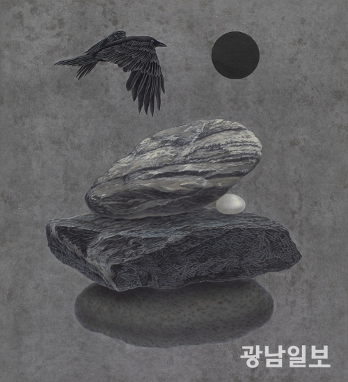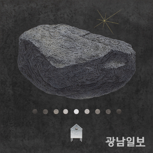 특히 돌은 단순히 놓이는 물체가 아니다. 빛과 바람, 비 등 자연적 요소의 영향을 받는다. 천년, 이천 년에 걸쳐 깎이고 닳으며 둥글게 변형되는 과정속에서, 인간의 생애와 비교할 수 없는 시간성을 지니는데 작가는 이런 돌의 시간성과 형태, 균형을 화면 위로 옮겨, 불안과 취약함 속에서도 삶을 살아가는 태도, 즉 믿음을 시각화했다. 돌과 함께 등장하는 ‘작은 집’은 작가 자신을 상징한다. 작은 집은 돌과 관계를 맺기도 하고 잠시 떨어지기도 하면서 화면 속 존재로 나타난다. 작가는 돌이라는 영겁의 시간을 보낸 자연물 앞에서 한없이 작아진 ‘나’를 발견하며, 하루하루 불안을 믿음으로 바꾸는 과정을 반복한다. 작은 집은 거대한 돌을 지탱하거나, 돌 안에 숨으며 삶을 살아가는 태도와 예술가로서의 염원을 내포하고 있다. 이처럼 돌과 집, 그리고 자연물이 이루는 관계는 단순한 객체의 집합이 아니라, 서로의 과정과 시간을 존중하며 만들어진 하나의 생태계로 확장된다. 이번 전시 ‘밤을 딛고, 켜켜이’는 이런 믿음과 태도가 화면 위 돌에 켜켜이 쌓임으로 드러나는 순간을 담았다.