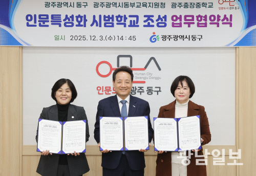 | 광주 동구는 2026년 새롭게 기획한 인문특성화 학교 추진을 위해 최근 동구청 접견실에서 광주동부교육지원청, 광주충장중학교와 ‘인문 특성화 시범학교 운영을 위한 업무협약’을 체결했다. |