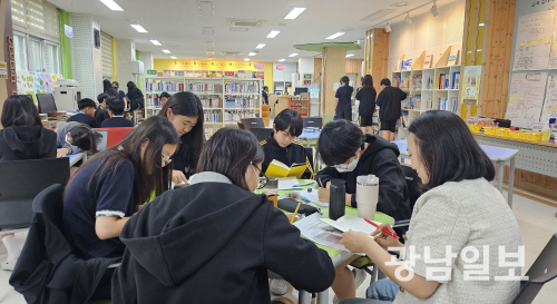 | 나주금천중 학생들이 도서관 중심 리터러시 교육활동을 하고 있다. |