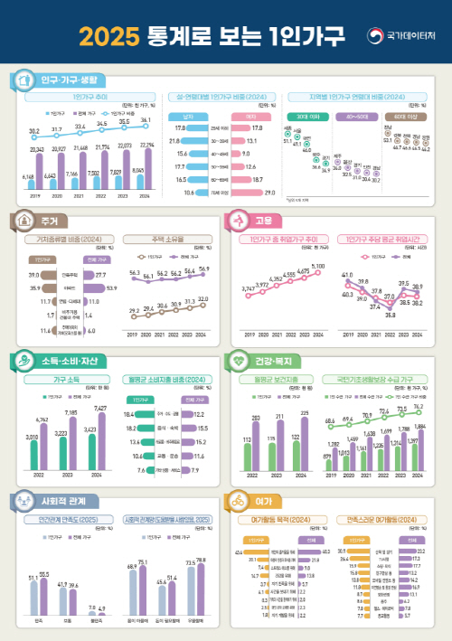 전국 1인 가구는 804만5000가구(남성 402만6000가구·여성 401만9000가구)로, 전체 가구에서 차지하는 비중은 36.1%로 전년보다 0.6%p 상승하며 역대 가장 높았다.