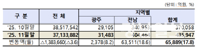 9일 한국거래소 광주혁신성장센터가 내놓은 ‘2025년 11월 광주·전남지역 상장법인 증시동향’에 따르면 지난달 지역 내 상장법인(38개사)의 시가총액은 전월 대비 17.8%(6조5889억원) 증가한 43조5947억원으로 집계됐다.