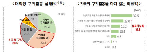 적극적으로 구직활동을 하지 않는 가장 큰 이유는 △자신의 역량·기술·지식 부족에 따른 추가 준비(37.5%) 였다. 이어 △구직활동을 해도 일자리를 구하지 못할 것 같아서(22.0%) △전공 또는 관심 분야의 일자리 부족(16.2%) △적합한 임금수준 등 근로조건을 갖춘 일자리 부족(13.6%)을 꼽아 응답 학생 절반 이상(51.8%)이 ‘일자리 부족’ 문제를 지적했다.