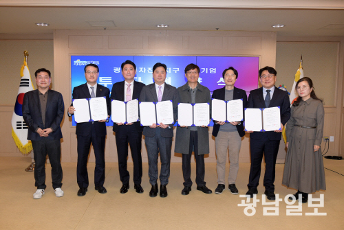 | 광주시는 10일 시청 비즈니스룸에서 ㈜부커스, ㈜아름게임즈, 미디어스코프㈜, ㈜지담미디어와 ‘아시아문화중심도시 투자진흥지구 진흥 투자협약’을 체결했다. |