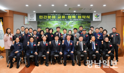 11일 담양군에 따르면 전날 청사 면앙정실에서 문화, 예술, 스포츠, 고향사랑기부, 경마공원 공동유치 대응 등 지역 사회 전반에 걸쳐 상호 협력 체계를 구축하고 민간분야 교류를 보다 활성화하기 위한 협약 체결식을 가졌다.