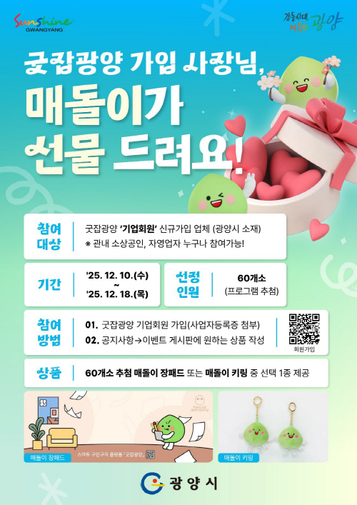 총 60개 업체를 추첨해 22일 굿잡광양 누리집에 결과를 게시하며, 당첨 기업에는 매돌이 장패드 또는 매돌이 키링 중 1종이 제공된다.