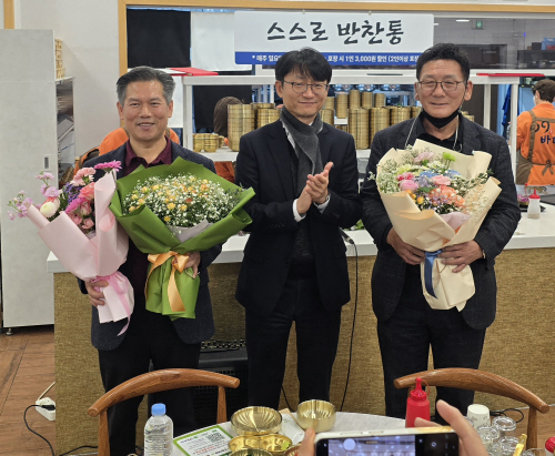 | 왼쪽부터 박형국 제4대 광주 광산구 골목형상점가 상인연합회장, 김도균 광산구 시민경제과장, 이몽룡 제3대 광주 광산구 골목형상점가 상인연합회장. |
