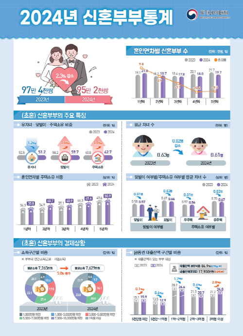 한편 신혼부부통계는 저출생 주요정책 수립 등에 필요한 기초자료를 제공하고자 2016년부터 매년 작성하고 있다. 통계대상은 매년 11월 1일 기준 혼인 신고한 지 5년이 경과 되지 않은 부부 중에서 혼인관계를 유지 중이며, 국내에 거주(부부 중 1명 이상)하고 있는 부부다.
