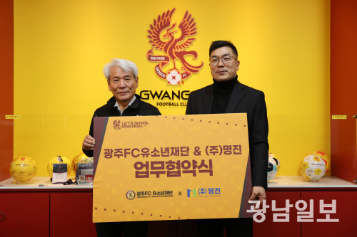 | 광주FC 유소년재단이 지역 스포츠 활성화를 위해 ㈜명진택과 손을 맞잡았다. 사진은 노동일 유소년재단 이사장(왼쪽)과 정도성 명진택 전무가 기념 촬영을 하고 있는 모습. 사진제공=광주FC |